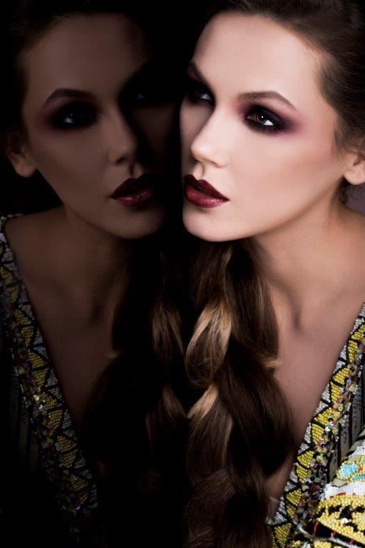 1.מוריחים פרמייר על עור הפנים ומעליו. מניחים מעליו מייק אפ נוזלי ודק. מורחים צללית בסיס בצבע טבעי על העפעפיים ועל עצם הגבה. יוצרים נקודת אור בעזרת צללית לבנה באזור זווית העין הקרובה לאף. מעל גלגל העין מניחים שכבה נוספת של צללית בגוון בורדו יין במרקם מט.