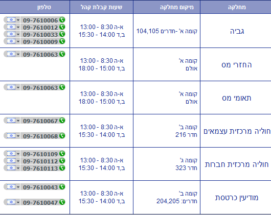 שעות קבלת קהל חוליה מרכזית/ תיאומי מס/ גביה/ פיצויים וקופות גמל/ רשת וכרטסת/ מיסוי מקרקעין/ מע"מ: א',ב',ד',ה' בין השעות 08:30-13:00 בנוסף ב',ד' בין השעות 15:00-18:00                         ימי ג'- אין קבלת קהל   מודיעין: א'-ה' 08:30-13:00 בנוסף א',ב',ד' 15:00-18:00   מכס: א'-ה' 08:30-13:30   מחלקת פעולות איבה: א'-ה' 08:30-13:00 בנוסף 14:00-15:30   [caption id="attachment_32964" align="aligncenter" width="530"]מס הכנסה כפר סבא מס הכנסה כפר סבא[/caption]